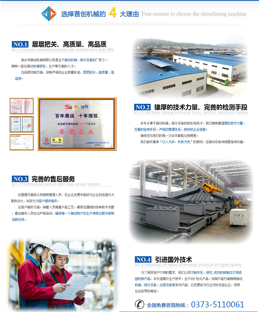 在客戶服務方面,銷售人員精通產品工藝,解答您遇到的各種技術問題,售后服務人員經過嚴格培訓,確保每一個首創用戶在生產使用過程中做到后顧無憂。 為了滿足用戶不同的需求, 我們公司不斷開發、研究,成功的研制出不同類型的新產品,并引進優良生產技術,生產出品質優良的產品。目前產品方面擁有振動機械、篩分設備、過濾設備等系列產品,已發展成為行業內標志型企業,深受社會各界的肯定。